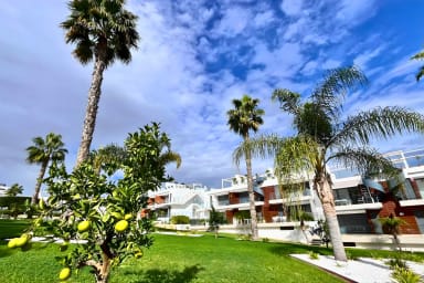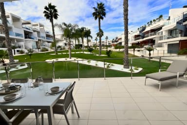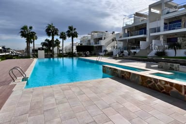 Bright new ground floor flat with large terrace and swimming pool. Ideal for families, couples or friends, accommodating up to 6 people. Located between Punta Prima and Los Altos, 10 minutes from beaches and shops, in a quiet, green setting.