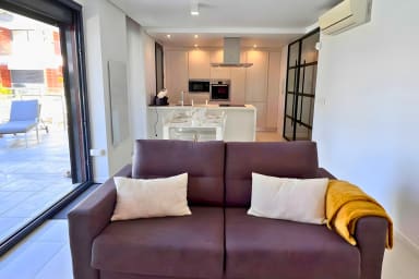 The living area comprises a spacious living room opening onto a fully equipped open-plan kitchen (modern appliances, crockery, plancha grill), with direct access to a large furnished terrace. The accommodation also has high-speed Wi-Fi and a private parking space in the basement, offering optimal comfort and complete peace of mind during your stay.