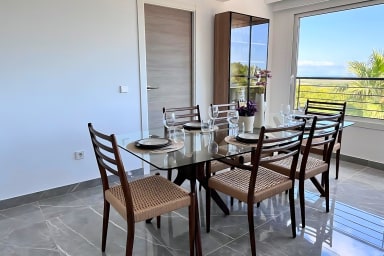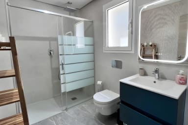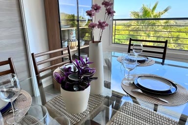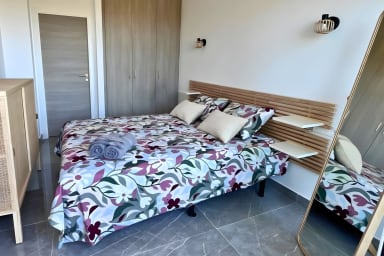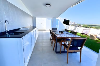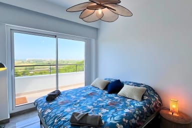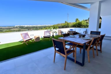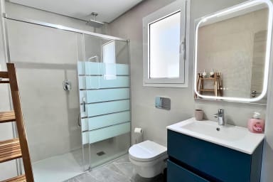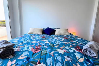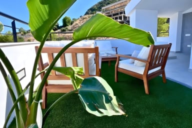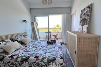 El apartamento cuenta con una amplia zona de estar bañada por la luz, gracias a sus ventanales que se abren a unas vistas despejadas. La cocina está totalmente equipada para cocinar como en casa, y el salón-comedor ofrece un espacio cómodo para compartir momentos agradables. Alba Blanca cuenta con 3 dormitorios, uno de ellos suite principal con baño privado y terraza, dos dormitorios adicionales con cama doble, uno de ellos con terraza, y un segundo baño moderno.