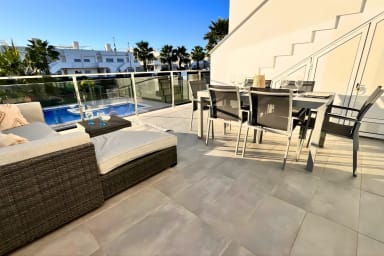 Desde el salón se accede a una amplia terraza amueblada con agradables vistas a la piscina de la residencia. Una escalera privada conduce a un generoso solárium, perfecto para relajarse, tomar el sol o disfrutar de un momento de tranquilidad mientras se admira una magnífica vista despejada.