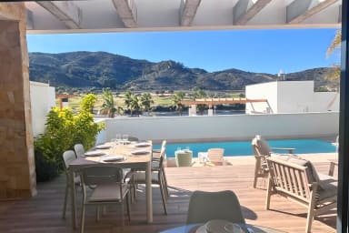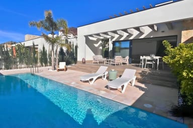Villa Almira es una villa de lujo con piscina privada situada en el corazón del campo de golf Font del Llop. Cuenta con 3 dormitorios, amplios espacios exteriores, una terraza solárium con vistas al campo de golf y todas las comodidades modernas. Un entorno natural exclusivo, cerca de Elche y Alicante, ideal para unas vacaciones de alto nivel.